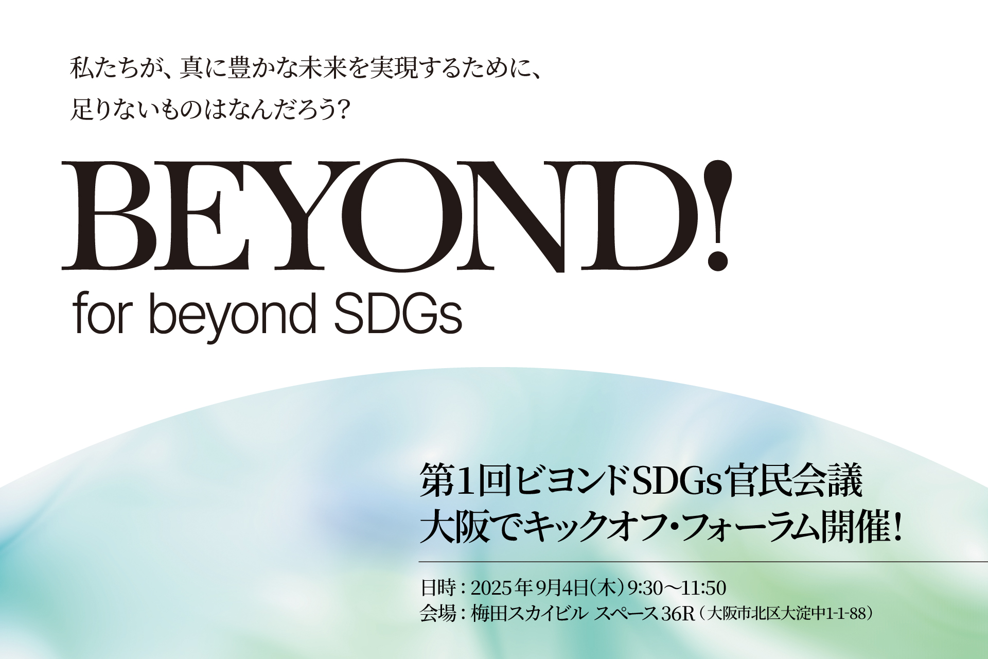 その第一歩として、2025年9月4日(木)、大阪・梅田スカイビルにてキックオフ・フォーラムを開催します。パネルディスカッション①では、政府、企業、市民、ユースの視点から具体的な取り組みを共有し、パネルディスカッション②では、ウェルビーイング、ガバナンス、科学の観点から、ビヨンドSDGsに不可欠な要素を探ります。